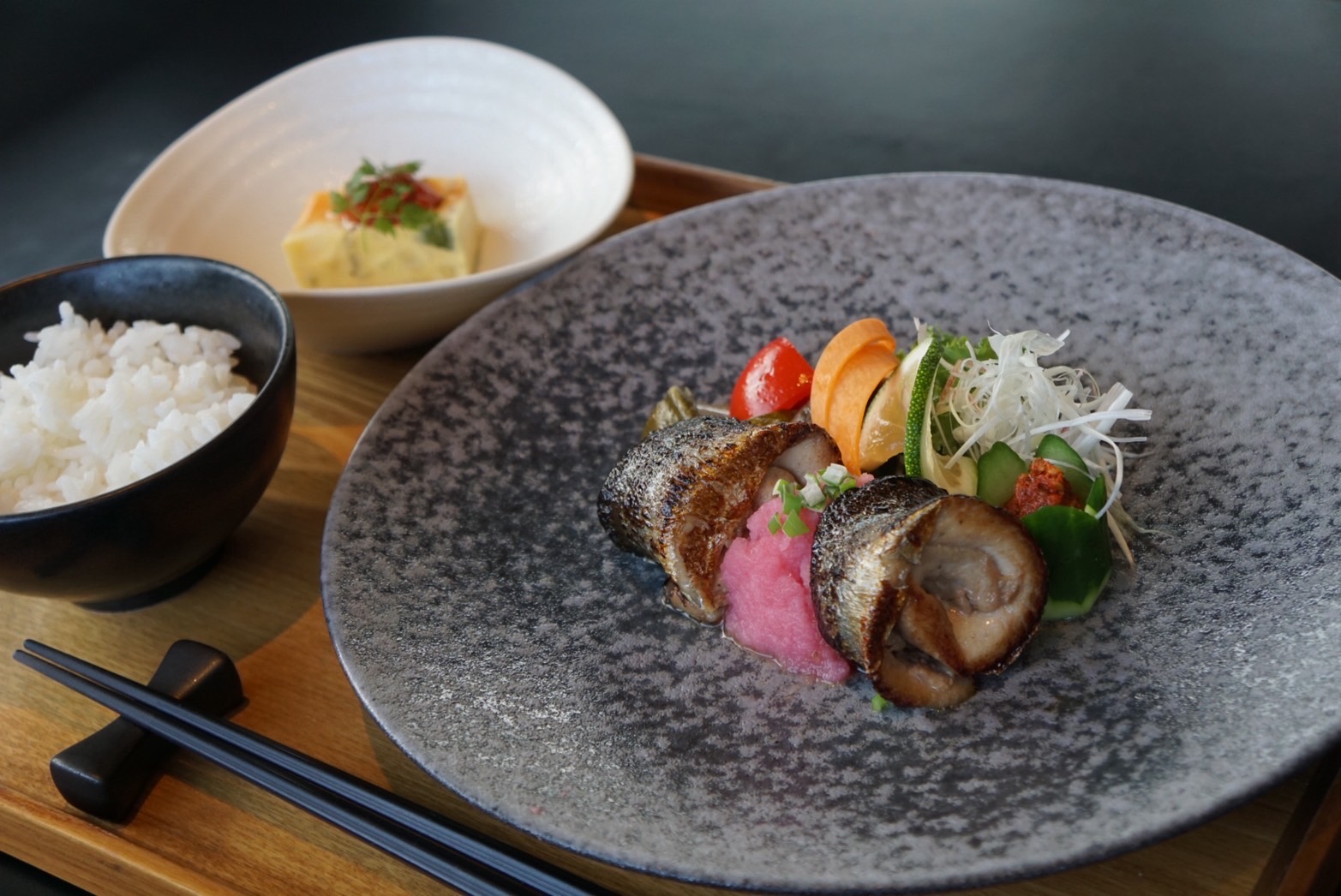 「秋刀魚の肝醤油炙り焼き 生七味唐辛子添え」です。