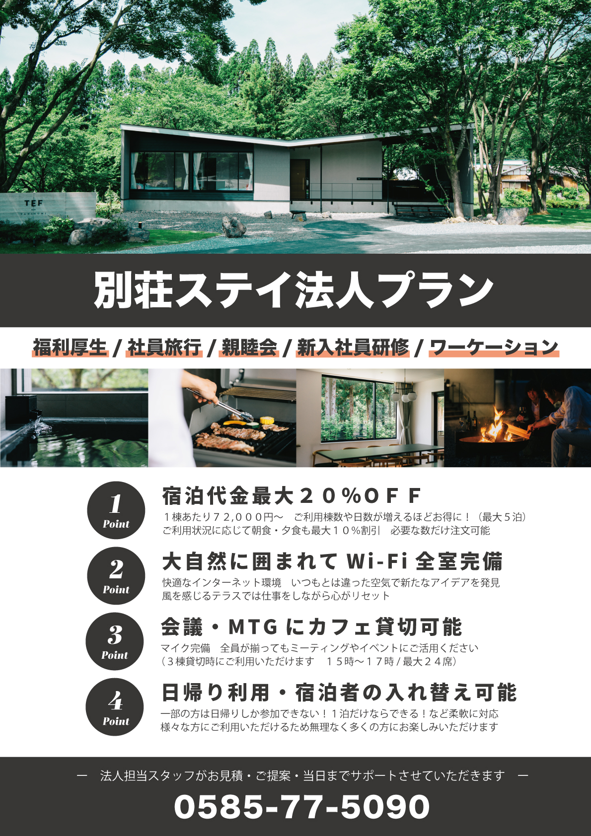 社員旅行やワーケーションなどを緑溢れる環境でお過ごしいただく中で、これまで以上に親睦を深めたり新たなアイデアに出会うことができます。素泊まりプランのため、プライベート感たっぷり・滞在のスタイルをカスタムできるのも大きな魅力です。連泊だからこそ味わえる贅沢な時間を心ゆくまでお楽しみください。